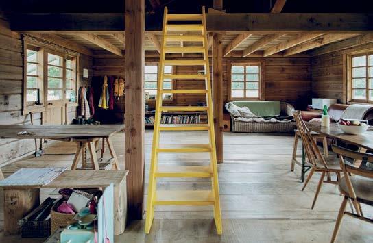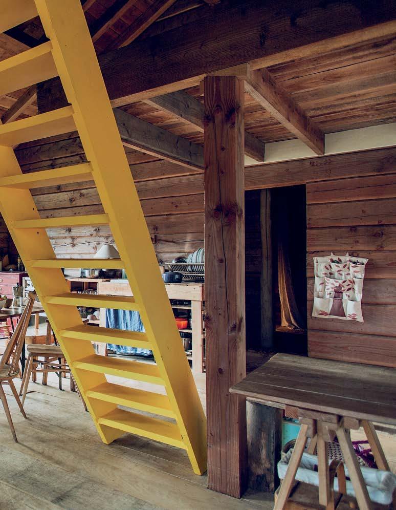Vle VO Žlutě natřené schodiště ze staré lodi spojuje obývák s patrem na spaní.