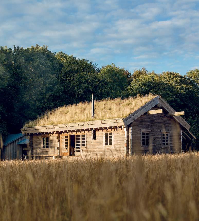 vnitřní roubenou stěnu, která funguje jako „tepelná masa“. Zelená střecha chatu izoluje v zimě i v létě.
