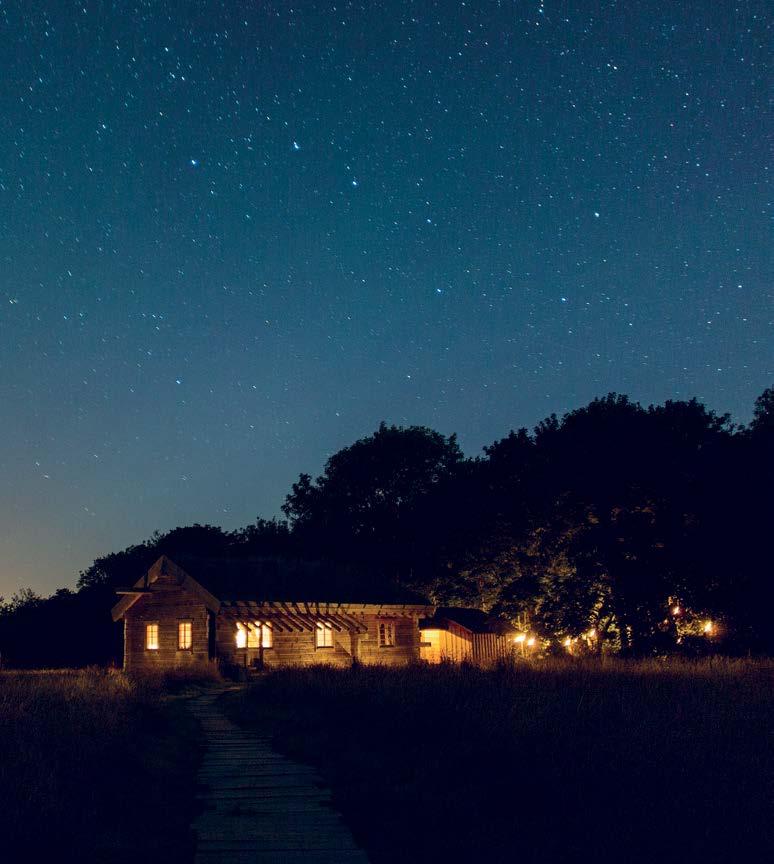 Pohled na chatu v noci od západu. Dřevěný chodníček vede přes louku ke vchodovým dveřím a zadní mýtinu osvětlují závěsná světla.