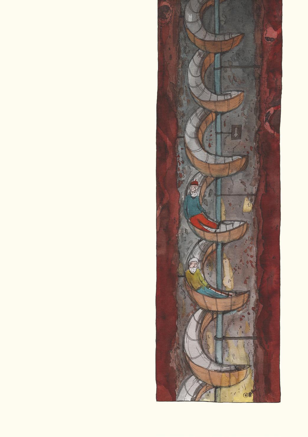 Naskočili na skluzavku vedoucí do hluboké tmy, ve které kdesi pod nimi probleskovala slabounká záře žárovky. Světlo sílilo, jak se přibližovali ke dnu šachty. Zabrzdili, seskočili ze skluzavky a vběhli do jedné z chodeb. Po pár metrech vyšli na prostorné náměstíčko lemované domy vytesanými ve skále. U jednoho se Rudolf zastavil. „Díky za hezký večer, byla to paráda. Musíme si to brzy zopakovat,“ rozloučil se a po špičkách vešel do domu.