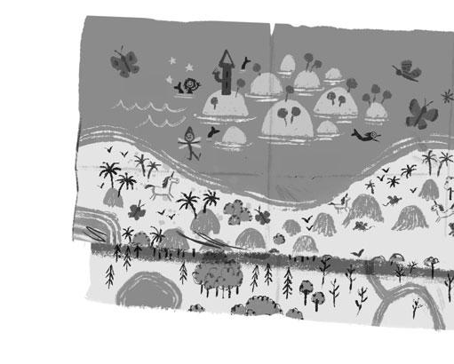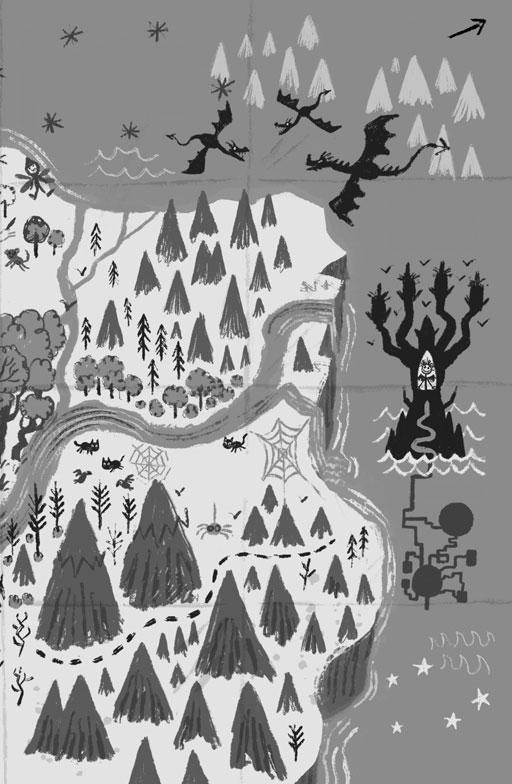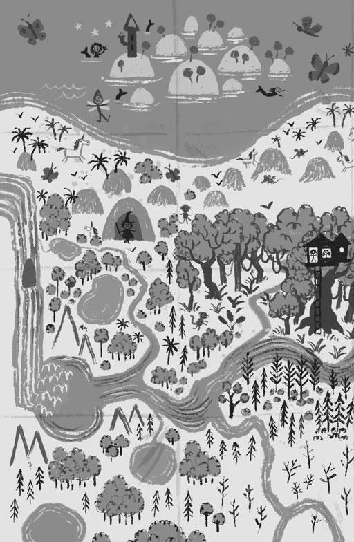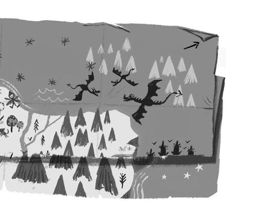 Dívám se na tu mapu a hra se mi v paměti postupně vrací. Dívám se na pohoří rozprostírající se mezi záhyby papíru a zvlněné pobřeží plné zátok a útesů. Je tu skupina ostrůvků ve tvaru bonbonů označená Ostrovstroví a hrad tyčící se z moře a po nebi se vznášejí tři draci. Všude se to jen hemží motýly, nebo jsou to možná víly, a zpoza stromů šibalsky vykukují jednorožci. Sice si nevzpomínám, jak