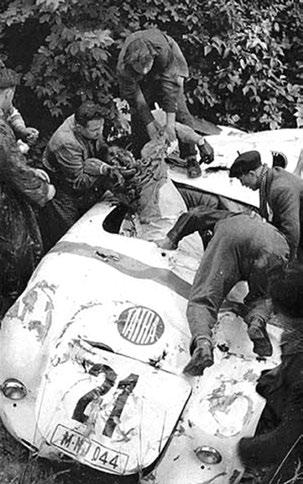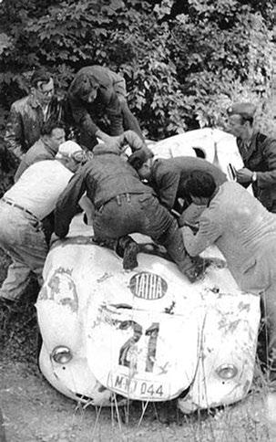 Už nebohému závodníku pomáhají z vozu nejbližší přítomní nešťastné nehody (z archivu Františka Bauera)