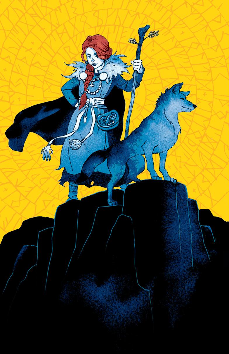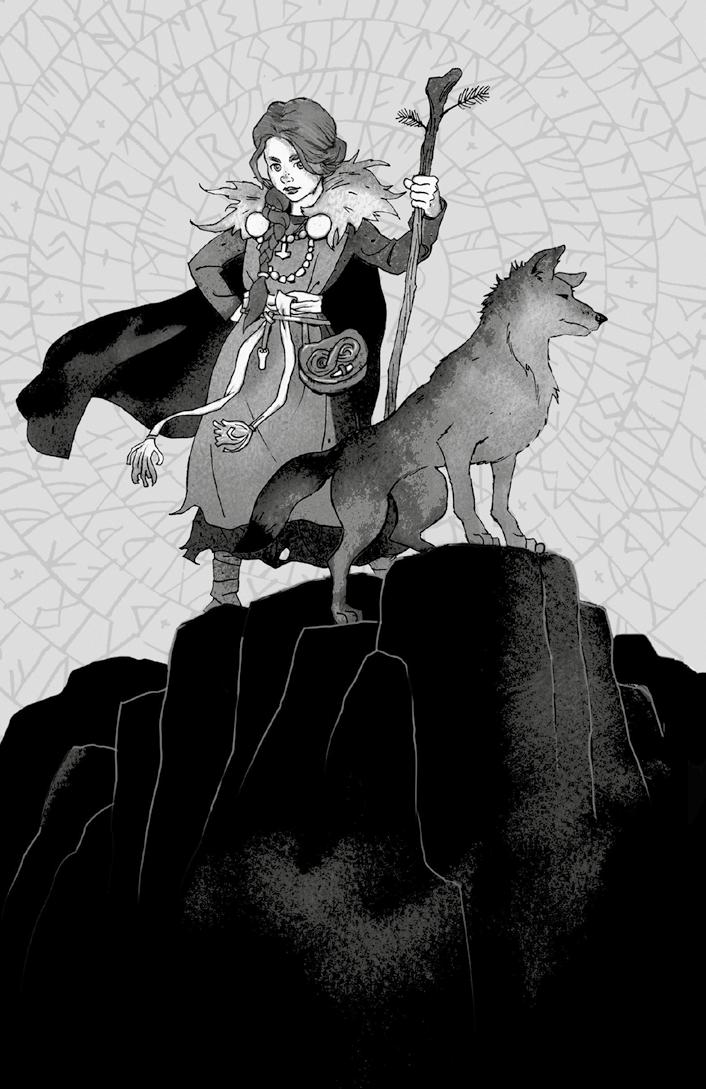Pomalu se začala sunout po matraci a sláma v ní praskala a šustila. Alva zatajila dech, ale matka s bratříčkem dál klidně pochrupovali. Došla si pro svůj plášť, pečlivě se do něj zabalila a obula si boty. Tichounce přešla místnost. Cestou se opatrně vyhýbala prknům, o kterých věděla, že skřípou. Nakoukla pod stůl, kde na tlusté dece tvrdě spal její vlk Fenrir. Přitiskla mu nos na čumák a zašeptala: „Fene.“