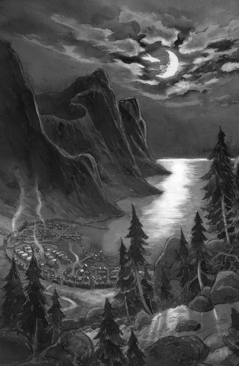 Všichni vesničané spali a jediné světlo poblikávalo z velké síně – Meginsalru. Byl to domov Jarla Erika, potomka samotných praotců, jehož kořeny sahaly až k samotnému Odinovi. Jeho ohniště bylo srdcem Kilsgardu.