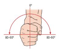Obr. 1.32 Technika intraartikulární punkce radiokarpálního kloubu. Na spojnici mezi processus styloidei na rozhraní jedné třetiny a dvou třetin laterálně z dorzálního přístupu. Jehla vedena kolmo ke kůži.