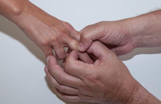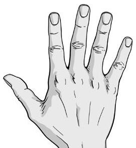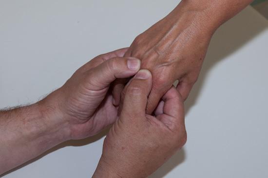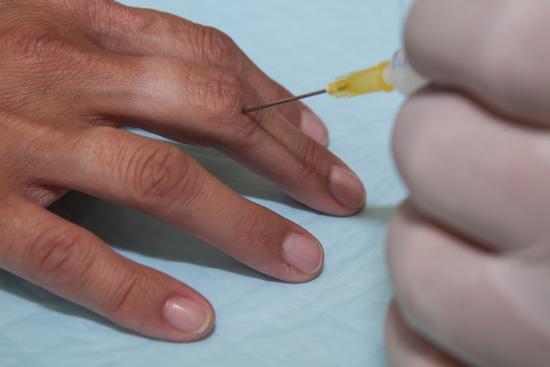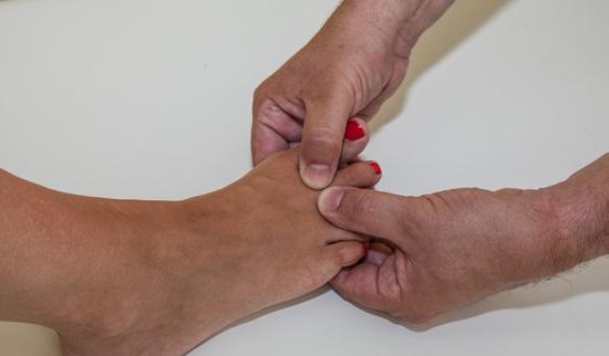 Obr. 1.29 Technika intraartikulární punkce interfalangeálních kloubů. Dorzální přístup kolmo ke kůži (90°) laterálně nebo mediálně.