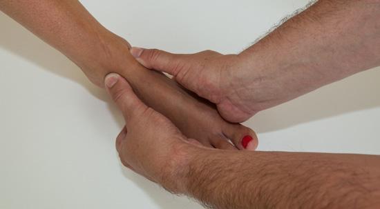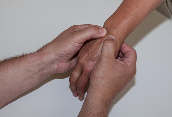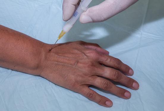 Obr. 1.31 Technika intraartikulární punkce radiokarpálního kloubu. Na spojnici mezi processus styloidei na rozhraní jedné třetiny a dvou třetin mediálně z dorzálního přístupu. Jehla vedena kolmo ke kůži.