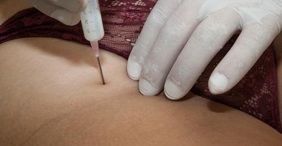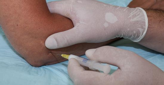 • Aplikace léčiva z laterálního a mediálního přístupu přímo nad radiálním a ulnárním epikondylem humeru při laterální nebo mediální epikondylitidě. Pozor na poškození šlachy.