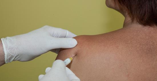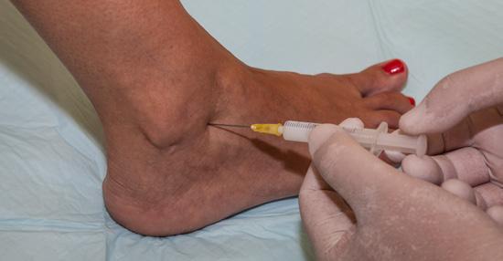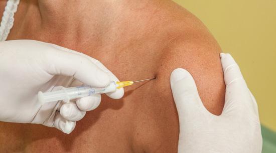 • Aplikace léčiva jehlou zavedenou pod úhlem proximálním směrem, tangenciálně ke šlaše dlouhé hlavy bicepsu v sulcus bicipitalis pažní kosti při tendinitidě šlachy. Pozor na poškození šlachy.