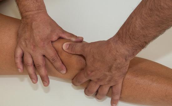 • Punkce bursa anserina na mediální ploše kolene přibližně 3 cm distálně od kloubní štěrbiny kolmo ke kůži.