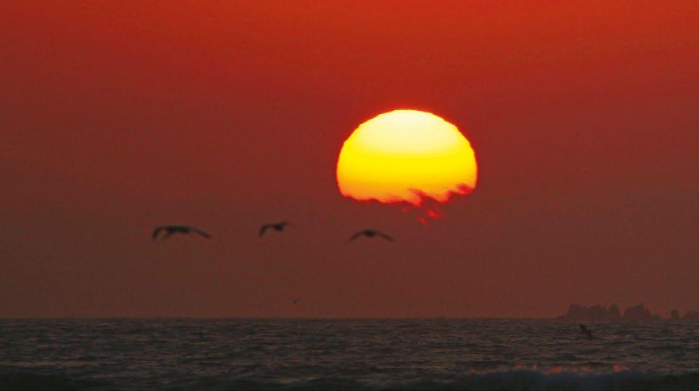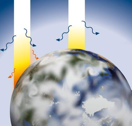 K tomu nám napomůže další pozorování: pouze vysoko na obloze vypadá Slunce světle žluté – blíže k horizontu ho oproti tomu vidíme čím dál víc v žlutooranžovém, oranžovém, nebo dokonce oranžově rudém odstínu. Protože by asi jen sotvakdo chtěl vážně tvrdit, že samotné Slunce mění svou barvu, musí také zde probíhat jiný proces – a možná dokonce tentýž, který je zodpovědný za modré nebe. Prohlédněme si obrázek na straně 8. V pravé části vidíme Slunce vysoko na nebi, přičemž cesta jeho světla přes zemskou atmosféru je nápadně krátká – teprve na posledních přibližně 50 kilometrech od zemského povrchu musí světlo procházet plynnou vrstvou, jejíž hustota vůbec stojí za zmínku a která se navíc směrem dolů podstatně zvyšuje. Naproti tomu v levé části obrázku se Slunce pro téhož pozorovatele nachází nízko nad obzorem. Nad vrstvu zemské atmosféry, stejně jako v minulém případě, přichází stále bílé sluneční světlo, pozorovatel na zemském povrchu však vidí Slunce v červených