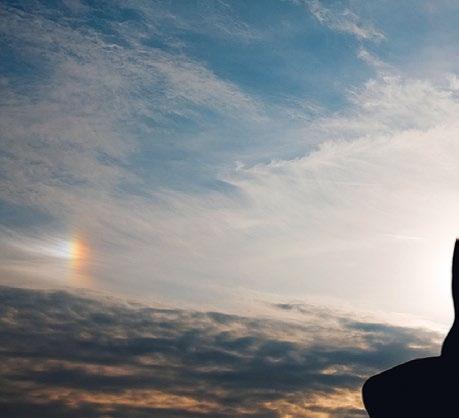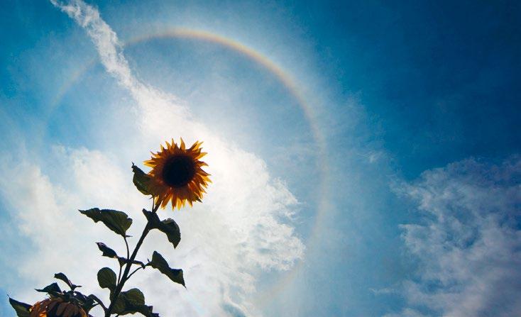 vnější okraj; dále směrem dovnitř se jednotlivé barvy překrývají a tím znovu skládají do jednotného šedého tónu. Také příležitostně pozorovaná irizace řídkých oblaků v okolí slunečního disku má svůj původ v lomu světla uvnitř oblaku.
