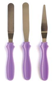 Špachtle a stěrky – pro nanášení a roztírání krému na povrch dortu. Asi jich budete muset pár vyzkoušet v ostrém provozu, než objevíte tu, která vám sedne. Každá totiž padne do dlaně jinak a teprve metodou pokus–omyl najdeme tu ideální. Špachtle a stěrky mohou být kovové či plastové. Nejdůležitější je, aby se vám s nimi dobře a precizně pracovalo, protože i ta sebemenší nedokonalost a nerovnost bývá na obmazu krémem docela vidět.