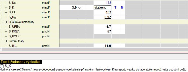 CAVE! Pseudohyperkalemie u hematoonkologických pacientů (nejčastěji leukocytóza, ale i trombocytóza), nezralé elementy se snáze poškodí při transportu potrubní poštou. Hodnoty přes 10 mmol/l nápadně upozorní na tuto možnost, hodnoty kolem 5 mmol/l mohou překrýt reálnou hypokalemii. U těchto pacientů je nezbytné vyloučit pro transport vzorku potrubní poštu. Referenční rozmezí: 3,8–5,0 mmol/l