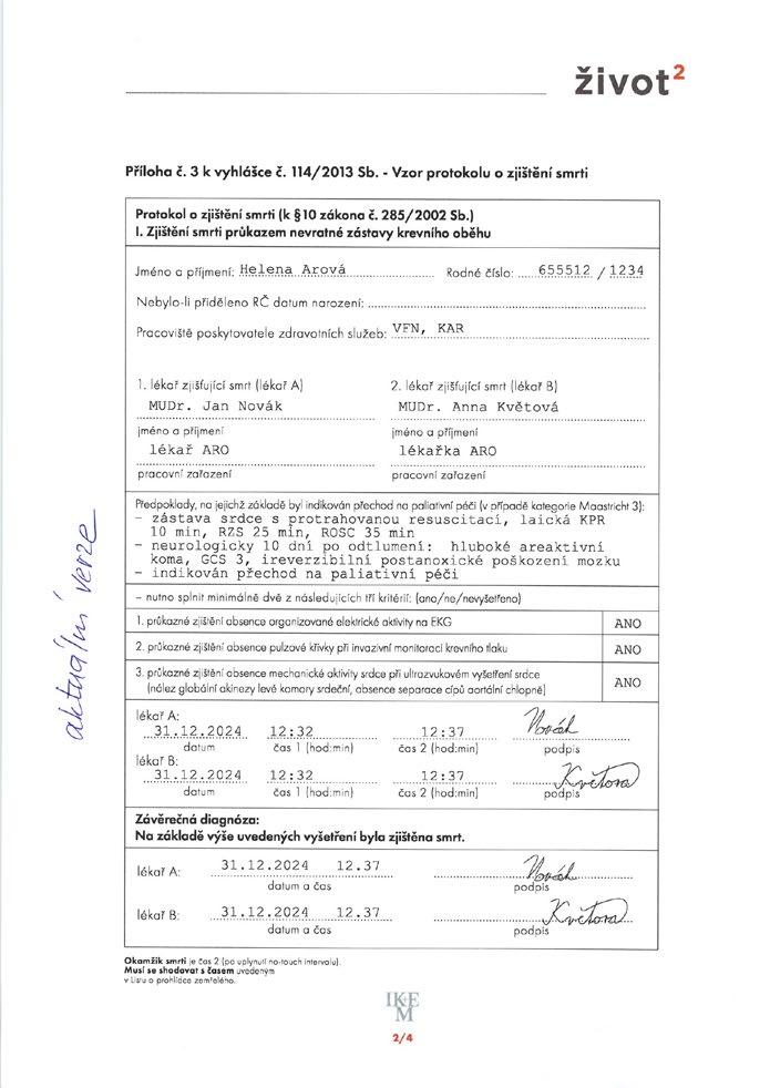 Obr. 4.1 Vzor vyplněného protokolu o zjištění smrti nevratnou zástavou krevního oběhu (konkrétní jména a údaje jsou fiktivní)