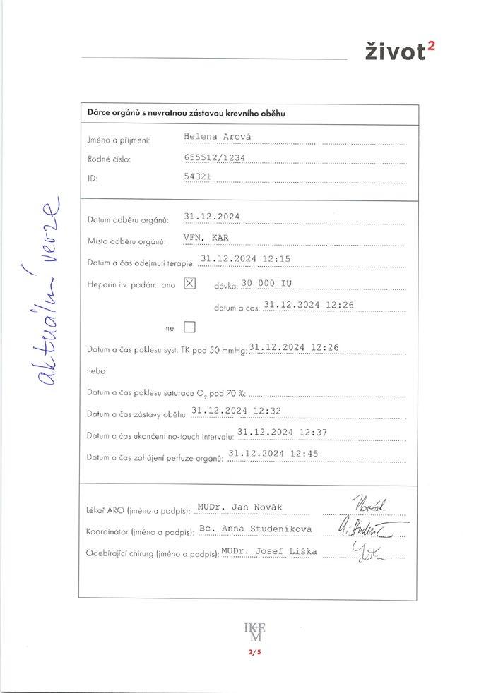 Obr. 4.2 Vzor zápisu základních údajů při odběru orgánů od DCD