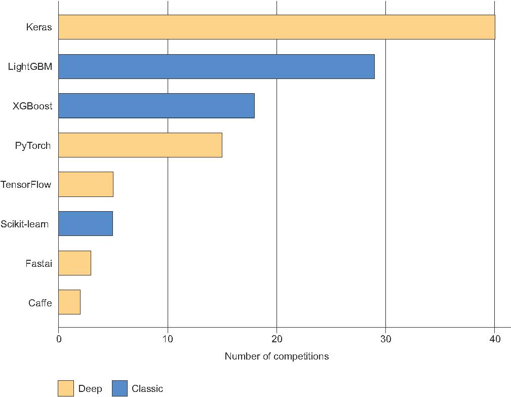 Existuje-li jedna datová sada, která byla katalyzátorem vzestupu hlubokého učení, je to datová sada ImageNet, jež se skládá ze 1,4 milionu snímků, z nichž každý byl ručně zařazen do jedné z 1000 kategorií. Ale to, co dělá ImageNet výjimečným, není jen jeho velikost, ale také s ním spojená každoroční soutěž. 9 Jak od roku 2010 demonstruje Kaggle, veřejné soutěže jsou vynikajícím způsobem, jak motivovat výzkumníky a inženýry, aby posouvali hranice. Společné benchmarky, o jejichž překonání výzkumníci soutěží, výrazně pomohly vzestupu hlubokého učení tím, že zdůraznily jeho úspěšnost v porovnání s klasickými přístupy strojového učení.