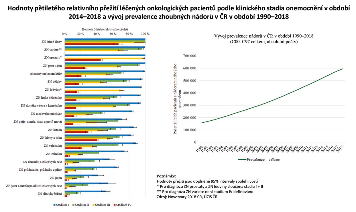 přežití. Celkové přežití zahrnuje úmrtí z jakékoliv příčiny, a je tak standardem reportovaným zejména v klinických studiích. Pokud je dostupný kvalitní záznam o příčinách úmrtí, je možné použít tzv. specifické přežití. Tento ukazatel se zaměřuje pouze na úmrtí související s diagnózou, s ostatními úmrtími je nakládáno speciálními metodami. Kromě standardních metod analýzy přežití je často nutné, aby nedošlo ke zkreslení výsledků, využít adekvátnější metodu kompetitivních rizik, kdy všechna úmrtí z jiné příčiny považujeme za konkurující události, které svým výskytem zabrání výskytu úmrtí souvisejícího s diagnózou. Nejsou-li však k dispozici přesné záznamy o příčinách úmrtí, například pokud čerpáme data z registrů, je možné přežívání ve vztahu k danému onemocnění popsat pomocí tzv. relativního přežití. Relativní přežití vyjadřuje poměr mezi celkovým přežitím u pacientů s daným onemocněním a očekávaným přežitím ve srovnatelné (věkem, pohlavím apod.) kohortě lidí bez tohoto onemocnění. Díky němu tak dokážeme zodpovědět otázku, zda onkologické onemocnění zkracuje život. Podobně jako u jiných populačních ukazatelů
