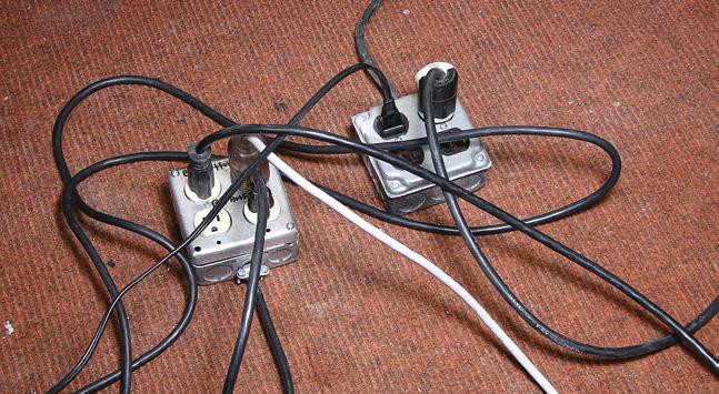 I z tohoto důvodu byste se měli vyhnout prodlužovacím kabelům nataženým přes pracovní prostor, kde o ně můžete stále zakopávat (viz 1.9). A pokud už je tudy musíte vést, snažte se je položit podél zdi, nebo alespoň přilepte k podlaze páskou.