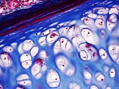 ♦ Chrupavčitá tkáň je sice složená také z buněk, mezibuněčné hmoty, kolagenních a elastických vláken, ale jednotlivé stavební komponenty mají oproti vazivové tkáni kvantitativně různé zastoupení a prostorové uspořádání. Vzhledem k těmto rozdílům má chrupavčitá tkáň jiné biomechanické vlastnosti než ostatní pojivové tkáně. Základními typy chrupavek je kloubní (hyalinní), elastická a vazivová chrupavka: