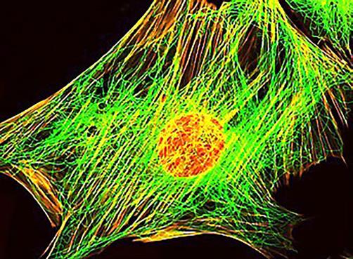 Obr. 1.6 Cytoskelet: 1 – buněčné jádro, 2 – mikrotrubice a mikrovlákna
