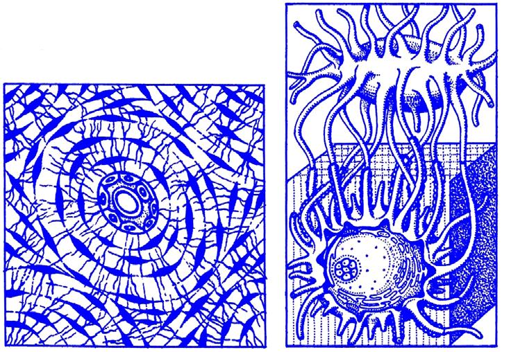 ♦ Vazivová tkáň je tvořena vazivovými buňkami, kolagenními, elastickými a retikulárními vlákny a beztvarou mezibuněčnou hmotou tvořenou převážně proteoglykany. Tuhé vazivo tvoří především vazy a šlachy, řídké vazivo reprezentuje především tzv. vmezeřené vazivo a elastické vazivo formuje některé vazy páteře (obr. 1.8). Tukové vazivo vytváří podkožní tukovou vrstvu a tukové polštáře kolem některých orgánů a lymfoidní vazivo je „skeletem“ mízních uzlin.