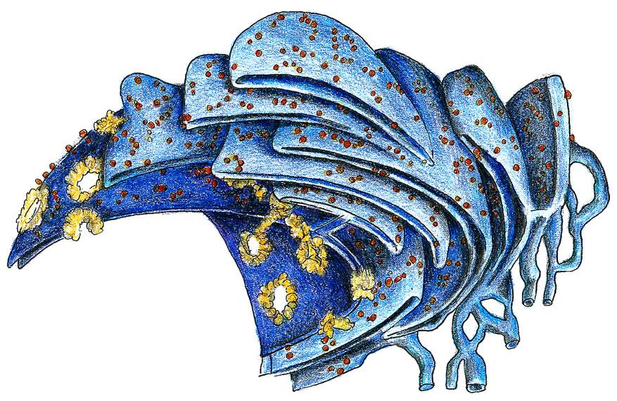 • tvorbu bílkovin: jádro, jadérko, ribozomy a Golgiho komplex,