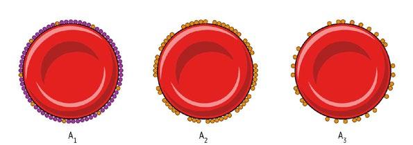 Obr. 2.1 Podskupiny A – počet antigenních míst. Od A1 po Am klesá přítomnost antigenu A a stoupá přítomnost antigenu H.