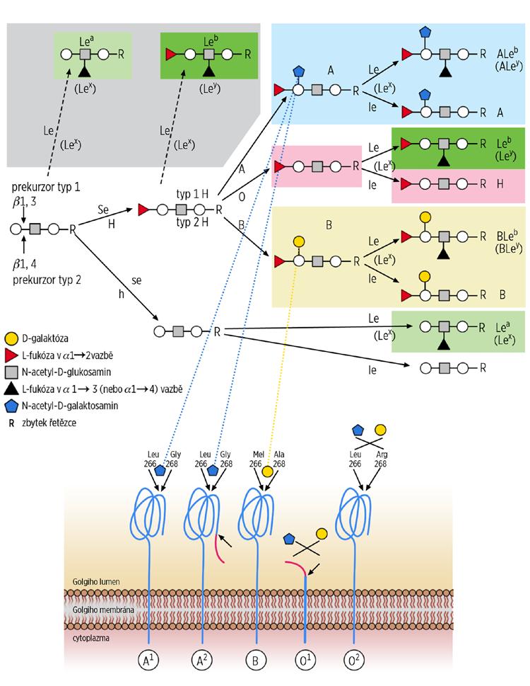 Tyto alely kódují glykosyltransferázy zodpovědné za syntézu antigenů A a B a za absenci této glykosylace u fenotypu 0 (homo-(di-)zygocie – obě alely pro nefunkční transferázy). Konečné formy antigenů tohoto systému jsou také ovlivňovány produkty genů kódujících fukosyltransferázy podílející se na výstavbě prekurzorového H řetězce: H (FUT1), Secretor (FUT2) a Lewis (FUT3) (tab. 2.5).