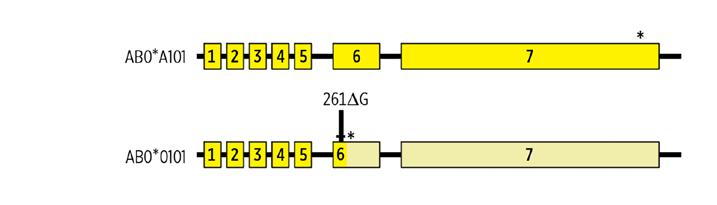 Gen AB0 se skládá ze 7 exonů, nukleotidové sekvence charakteristické pro A a B jsou v exonu 7, substituce zodpovědné za nefunkční 0 alely jsou v exonech 6 a 7. Genotypová rozmanitost v AB0 systému přesahuje rozdílnost fenotypovou (např. „evropská“ alela *A101 je jen u 20 % Japonců s fenotypem A1, ostatní mají „japonskou“ *A102 alelu