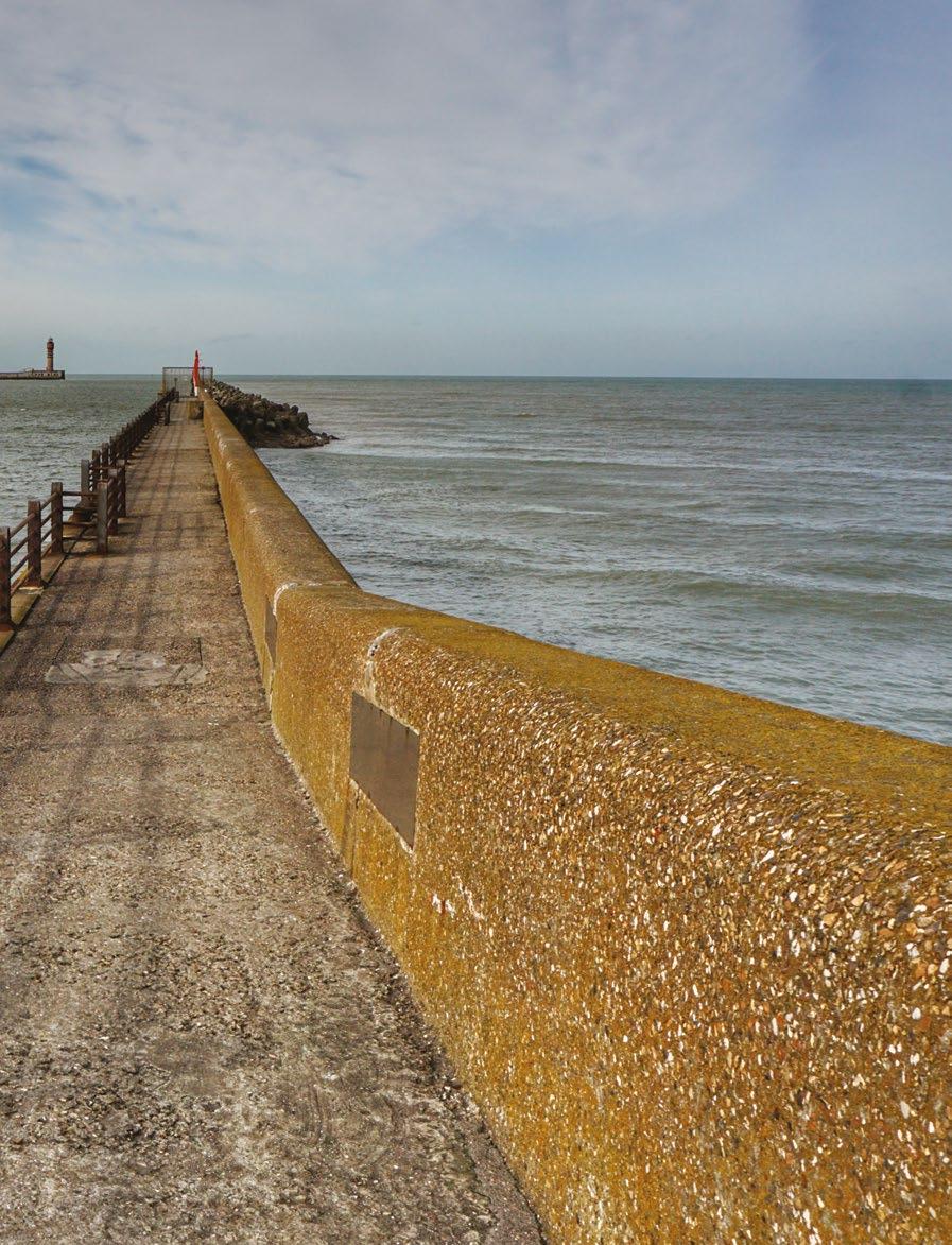 Přístavní hráz, Dunkerque, Francie Jelikož se městský přístav kvůli těžkému německému bombardování nedal použít, staly se pro evakuaci životně důležité dvě ochranné betonové hráze. Ani jedna sice nebyla konstruována pro vyvazování lodí, nicméně většina vojáků unikla z Dunkerque prostřednictvím východní hráze. Tento asi 800 metrů dlouhý vlnolam ukazoval do Anglie a do bezpečí, takže na něm čekaly v zástupech tisíce vojáků s nadějí na lodě, které je dopraví domů. Téměř nepřetržité německé letecké ostřelování a bombardování, snášející se z oblohy jako déšť, a pohled na lodě kolem, potápějící se do šedých vln, znamenaly pro čekající vojáky krutou, nervy drásající zkoušku.