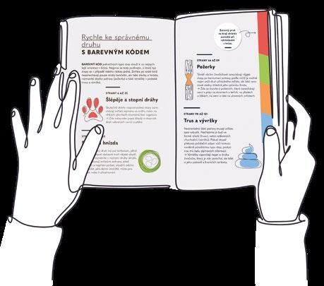 BAREVNÝ KÓD jednotlivých typů stop slouží k co nejrychlejší orientaci v knize. Nejprve se tedy podívejte, o který typ stopy se v případě vašeho nálezu jedná. Zvířata po sobě totiž nezanechávají pouze otisky končetin, ale také stavby a hnízda, rozmanité zbytky potravy (požerky) a také výměšky v podobě trusu a vývržků.