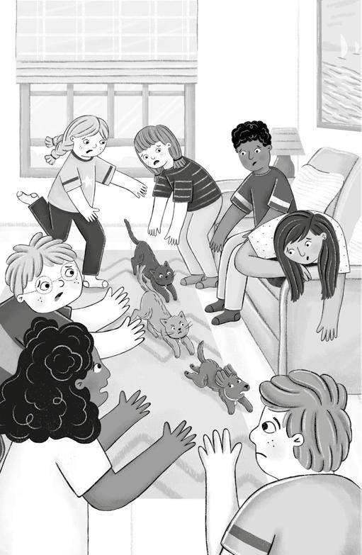 „Chyťte někdo Koko!“ zakřičela Elsa, když se její malé štěně snažilo protáhnout kolem pohovky a utéct dvěma obrovským kočkám, které se hnaly za jeho čokoládově hnědým ocasem. Všech šest členů Klubu štěňat se sešlo u Elsy na každotýdenní schůzce. Jejich klid