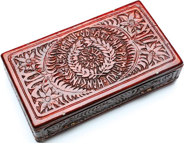 Dřevěná krabička s vyřezávaným dekorem, dar paní Haně od nejlepší přítelkyně Ati Oličové k svátku. Na krabičce je monogram „AB“ (Anna Benešová, zřejmě připomínka původního jména) a datum 26. 7. 1918, kdy má Hana svátek na Slovensku. (NM, H8-27.880)