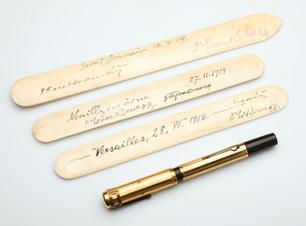 Nože na obálky ze slonoviny s daty a podpisy československých zástupců (Edvard Beneš, Karel Kramář a Štefan Osuský) a pero Edvarda Beneše, které použil při podpisu Versailleské mírové smlouvy 8. června 1919. Pero věnoval Benešovi irský spisovatel a žurnalista Emile Joseph Dillon, který se konference účastnil jako dopisovatel The Daily Telegraph. (NM, H827.872–27.875)