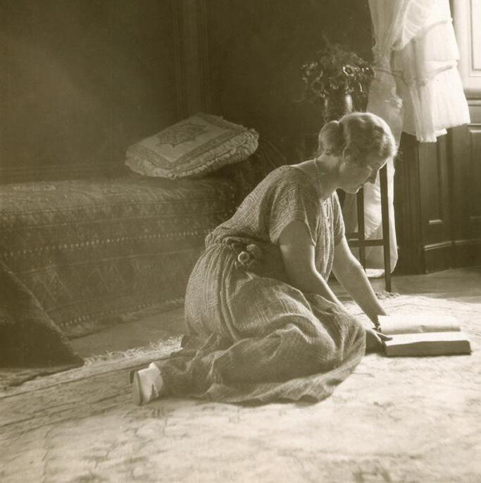 Hana Benešová čte knihu při odpočinku na zámku Lány, srpen 1923. (ANM, E. Beneš, foto 1923)