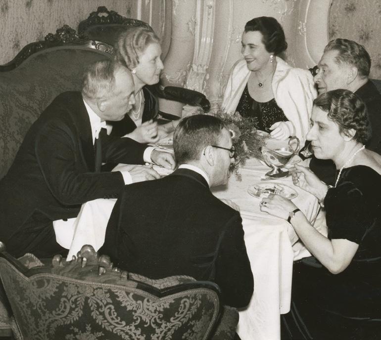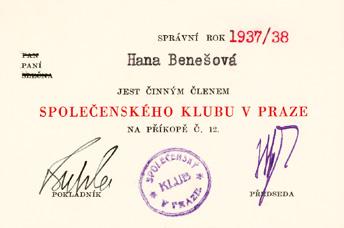 Setkání ve Společenském klubu v Praze, 6. února 1937, zleva – Edvard Beneš, Hana Benešová, v čele herečka Míla Pačová-Krčmářová a Jan Krčmář, dříve ministr školství a národní osvěty, zády neznámý muž s partnerkou. Hana Benešová a Jan Krčmář byli místopředsedy klubu. (ANM, Foto PNP1, 191) Členská legitimace Společenského klubu Hany Benešové, 1937. (ANM, H. Benešová, 11)