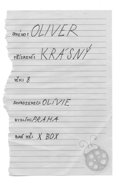 Jmenuji se Olivie Krásná a tohle je můj deník. Dala mi ho mamka. Musíme ho s bráchou psát, protože to mamce doporučila naše paní psycholožka. Prý nám to pomůže se líp soustředit.
