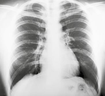 B spíše příčná poloha srdce v krátkém a širokém hrudníku; jsou viditelné stíny bronchů a plicních cév, rozbíhající se od plicních hilů