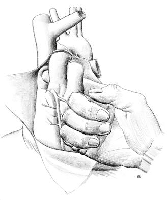 Hrot srdeční se promítá do 5. mezižebří, těsně navnitř od medioklavikulární čáry. Tep hrotu je tam i hmatný, zejména v předklonu (obr. 42).
