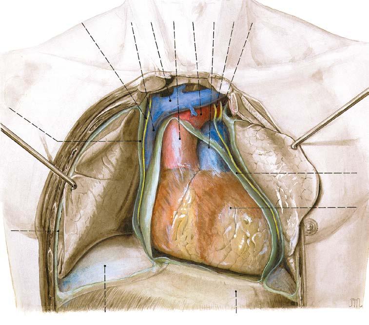 Punkce perikardu (např. při náplni perikardu tekutým produktem patologického procesu) se provádí v area pericardiaca, a to v 5. mezižebří těsně u sterna (mimo průběh a. thoracica interna podél sterna – viz str. 107). Boční stěny – partes laterales – perikardu jsou vyklenuté podle tvaru srdce proti mediastinální pleuře. Vpravo a vlevo po boční stěně probíhá brániční nerv – n. phrenicus – a a. pericardiacophrenica (větev z a. thoracica interna), provázená zpravidla dvěma vv. pericardiacophrenicae.