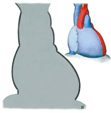 v levé šikmé projekci (obr. 51), označované jako projekce boxerská, tvoří srdeční stín symetricky obě komory, nad srdcem je patrný oblouk aorty v celé své šíři a pod ním rozestup a. pulmonalis dextra et sinistra; mezi aortou a aa. pulmonales je patrné tzv. „aortální okno“.