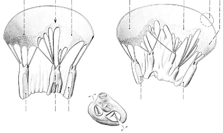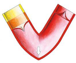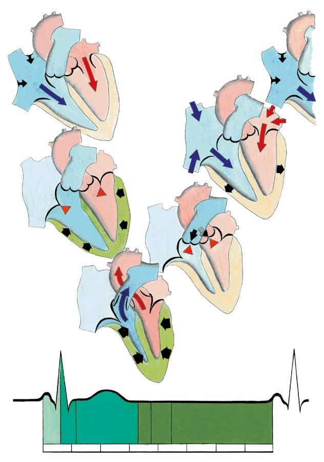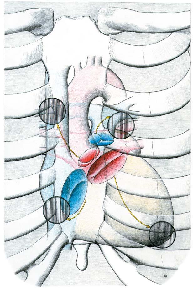 Obr. 45. PROJEKCE SRDEČNíCH CHLOPNí A AUSKULTAČNí MíSTA CHLOPNí modře – chlopně pravého srdce červeně – chlopně levého srdce žluté šipky – jdou od chlopní do míst, kam proud krve zanáší zvuk chlopně