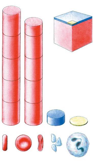 Obr. 4. POČETNí POMĚR JEDNOTLIVÝCH DRUHŮ KRVINEK; ve sloupečcích počty krvinek v 1 mm3 krve, v krychli znázorněn vzájemný poměr těchto počtů µ µ
