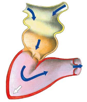 B VZNIK SINUS TRANSVERSUS PERICARDII, spojený se zakřivením srdeční kličky; šipka mezi porta arteriarum a porta venarum ukazuje místo příštího sinus transversus pericardii