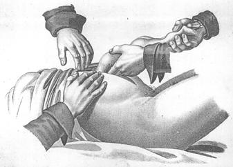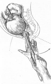 Obr. 1.32 Perforace hlavičky – nebezpečné, nesprávné nasazení nástroje (Wilhelm Gustav Liepmann: Der geburtshilfliche Phantomkurs. Berlin: Urban & Schwarzenberg 1922)
