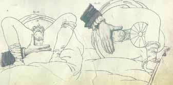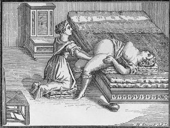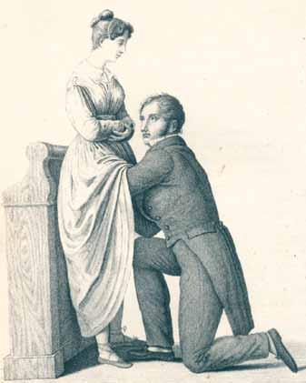 Obr. 1.31 Chránění hráze – anglická poloha na boku (Dietrich Wilhelm Heinrich Busch: Die theoretische und praktische Geburtskunde durch Abbildungen erläutert. Berlin: Rücker und Püchler 1838)