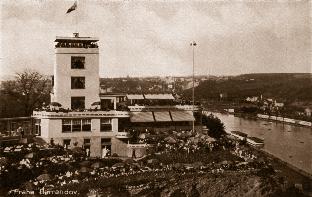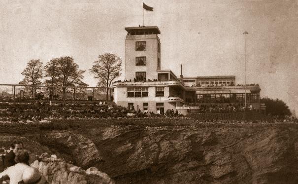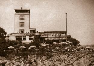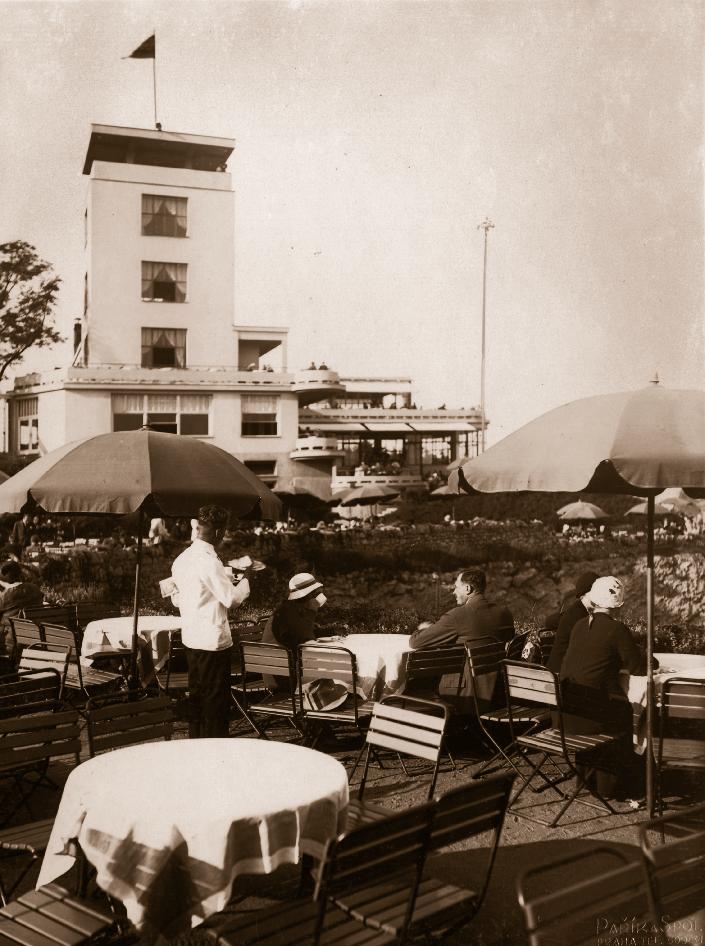 tě s bazénem. Vyvrcholením celé stavby byla budova kavárny a restaurace se sálovým prostorem, po obvodu plně proskleným, doplněným klubovnami a několika salóny ve vyhlídkové věži. Ta byla patnáct metrů vysoká. Na úzkém schodišti pak docházelo při frekventovaném pohybu číšníků nahoru a dolů k častým srážkám, což místní kolorit ještě zpestřovalo.