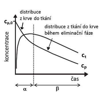 čiva v krevním řečišti a rychle perfundovaných tkáních) a dále hodnotou tzv. rychlostní konstanty eliminace k e, jejíž velikost ovlivňuje rychlost poklesu koncentrace s ubíhajícím časem. Vyšší hodnota k e odpovídá vyšší rychlosti eliminace. Podobný tvar má např. rovnice popisující rozpad ve velkém souboru radioaktivních prvků (rozpadový zákon).