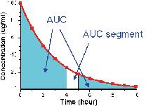Existuje způsob, jak jednoduše pomocí jedné charakteristiky, odvozené z křivky koncentrace-čas, porovnat celkovou expozici organizmu, tj. přetrvávání léčiva v plazmě, a tím i v ostatních částech organizmu při neustále se měnící koncentraci? Takovou charakteristikou je plocha pod křivkou koncentrace-čas, což je plocha ohraničená křivkou a časovou osou (osa nezávisle proměnných, tj. osa x). Je označována zkratkou AUC (z angl. area under the curve). Plocha pod křivkou se obecně vypočítá matematickou integrací dané závislosti, v našem případě závislosti koncentrace na čase, označené symbolem cp(t):
